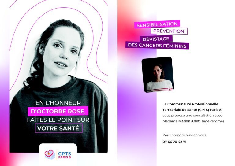 A l’occasion d’Octobre rose, mois de prévention et de sensibilisation aux cancers féminins (cancer du sein, du col de l’utérus, de l’ovaire et de l’endomètre), la CPTS Paris 8 vous propose une consultation avec Marion Arlot, sage-femme.